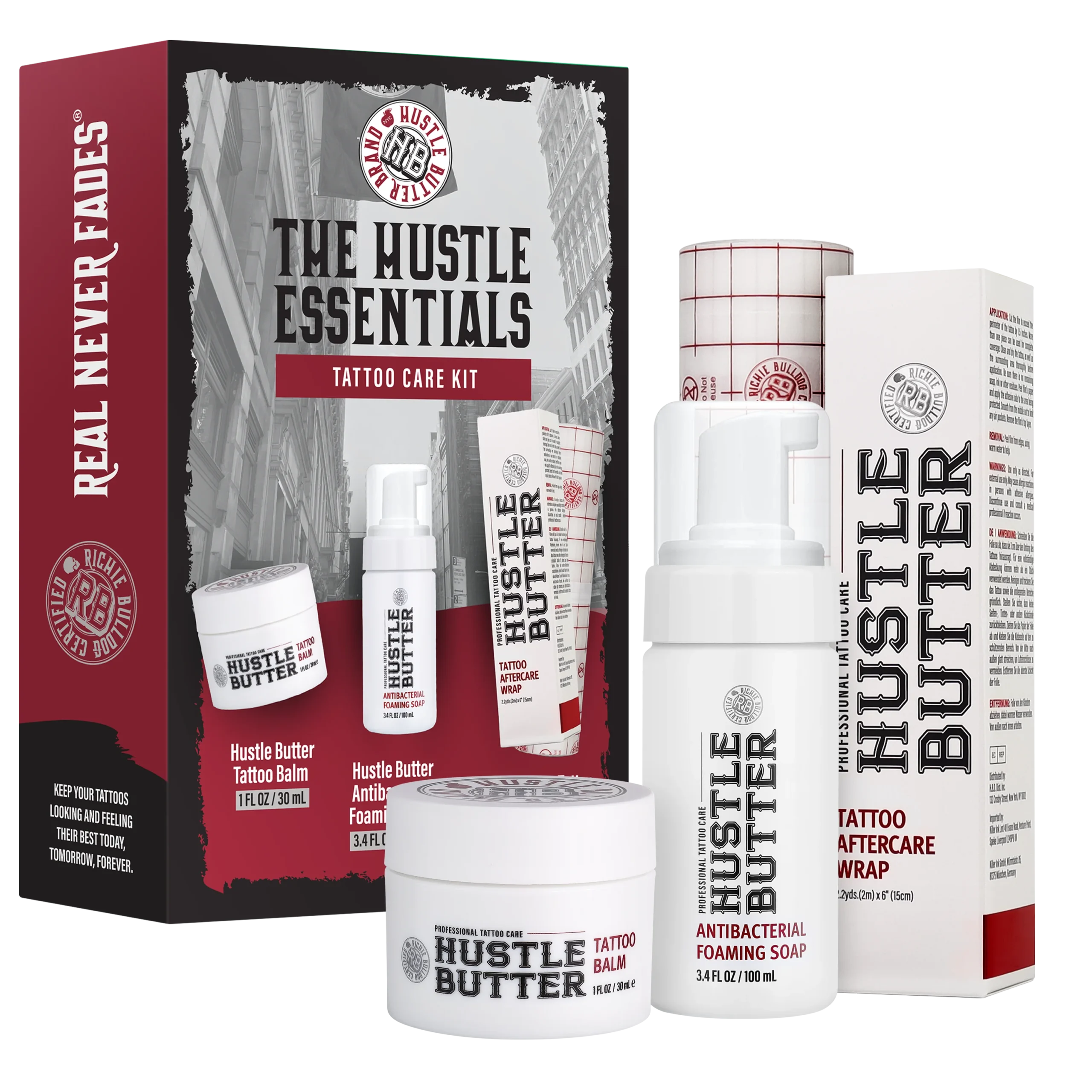 Kit Includes: 1x Hustle Butter Tattoo Balm (1 fl oz), 1x Hustle Bubbles Antibacterial Foaming Soap (3.4 fl oz), 1x Hustle Butter Tattoo Aftercare Wrap – Small (6 in x 2.2 yds)